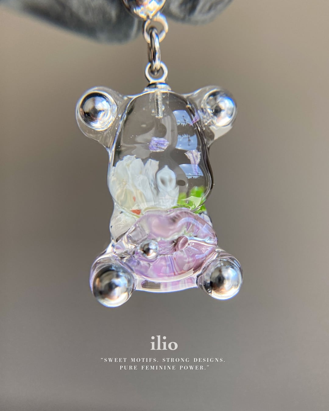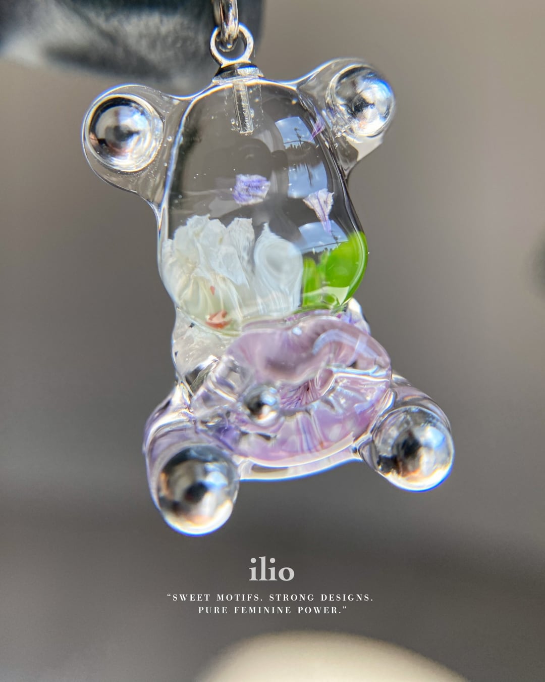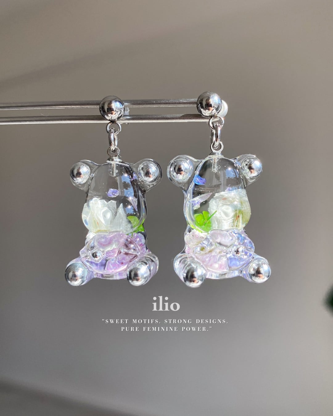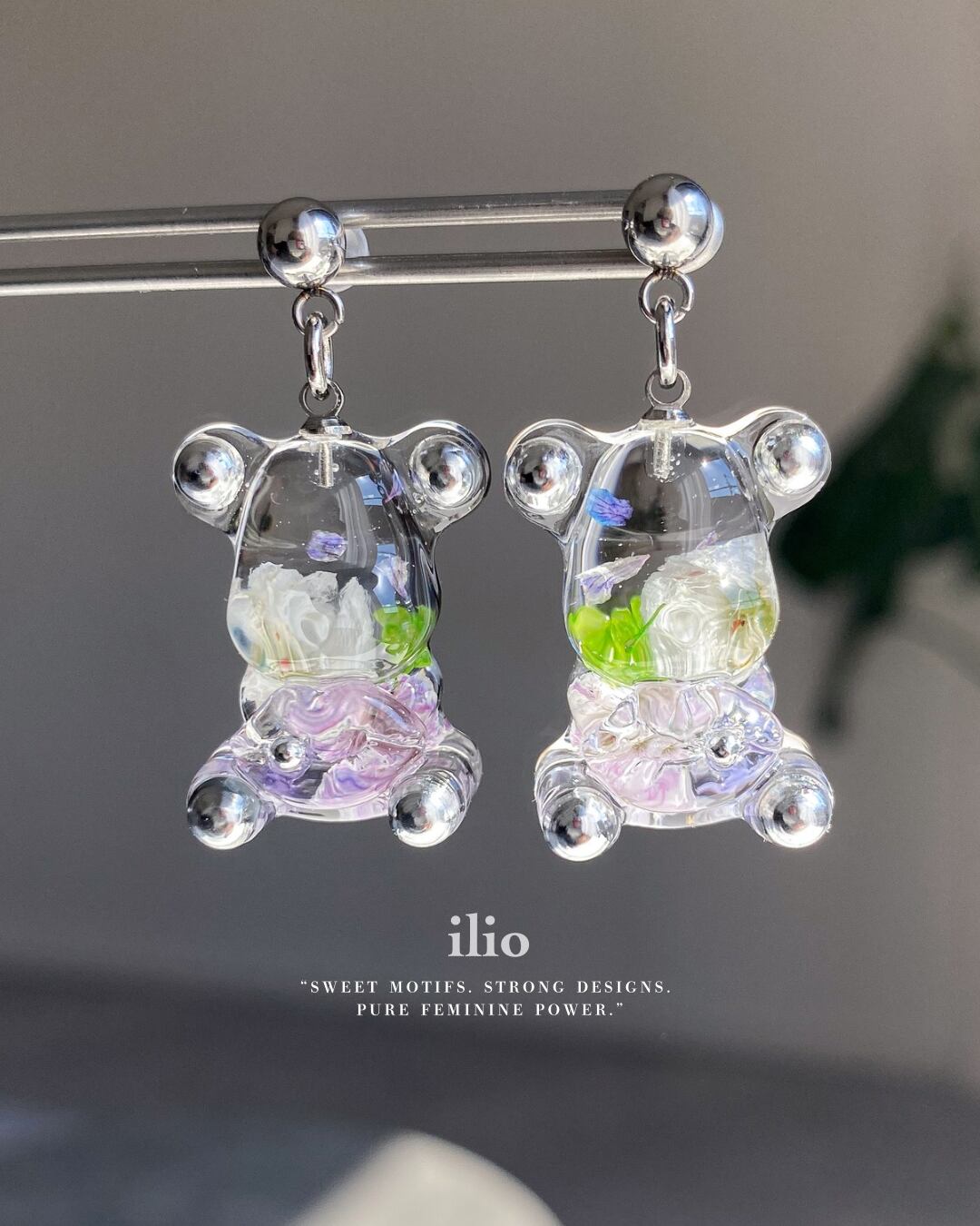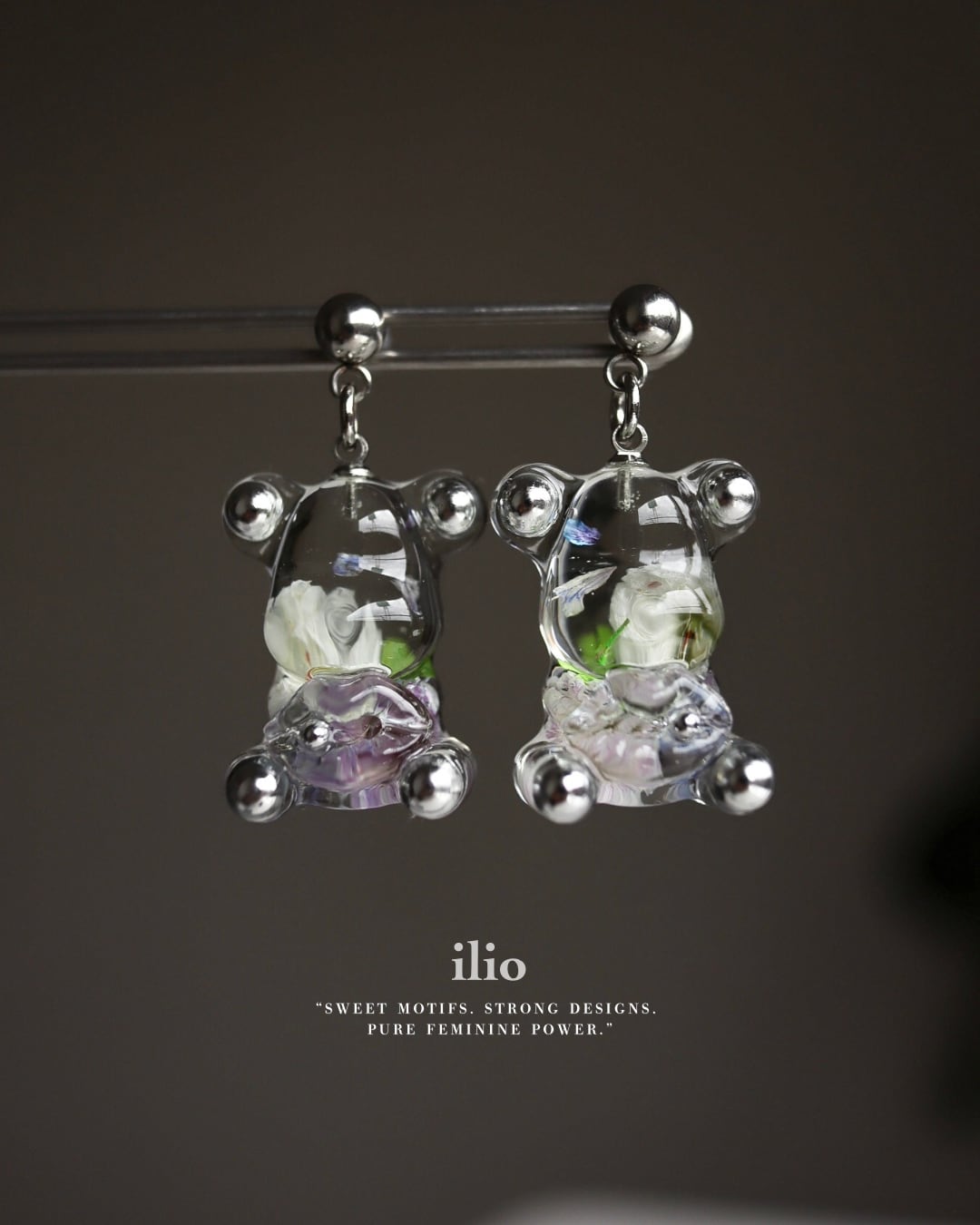 透明なフォルムの中に、花を閉じ込めたくまピアス。