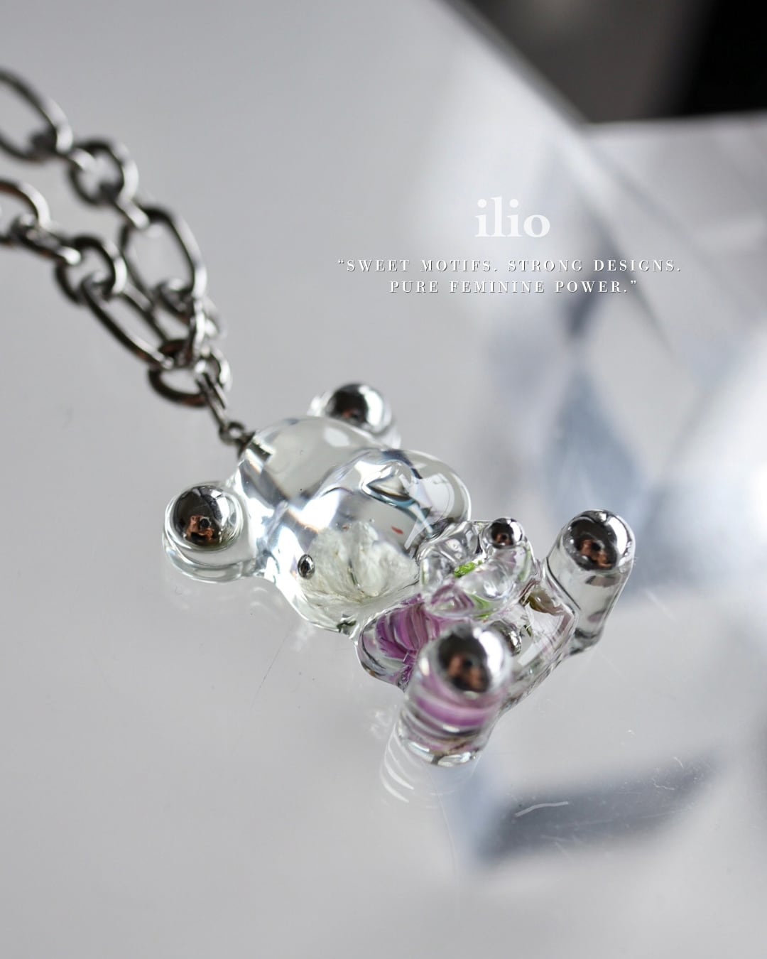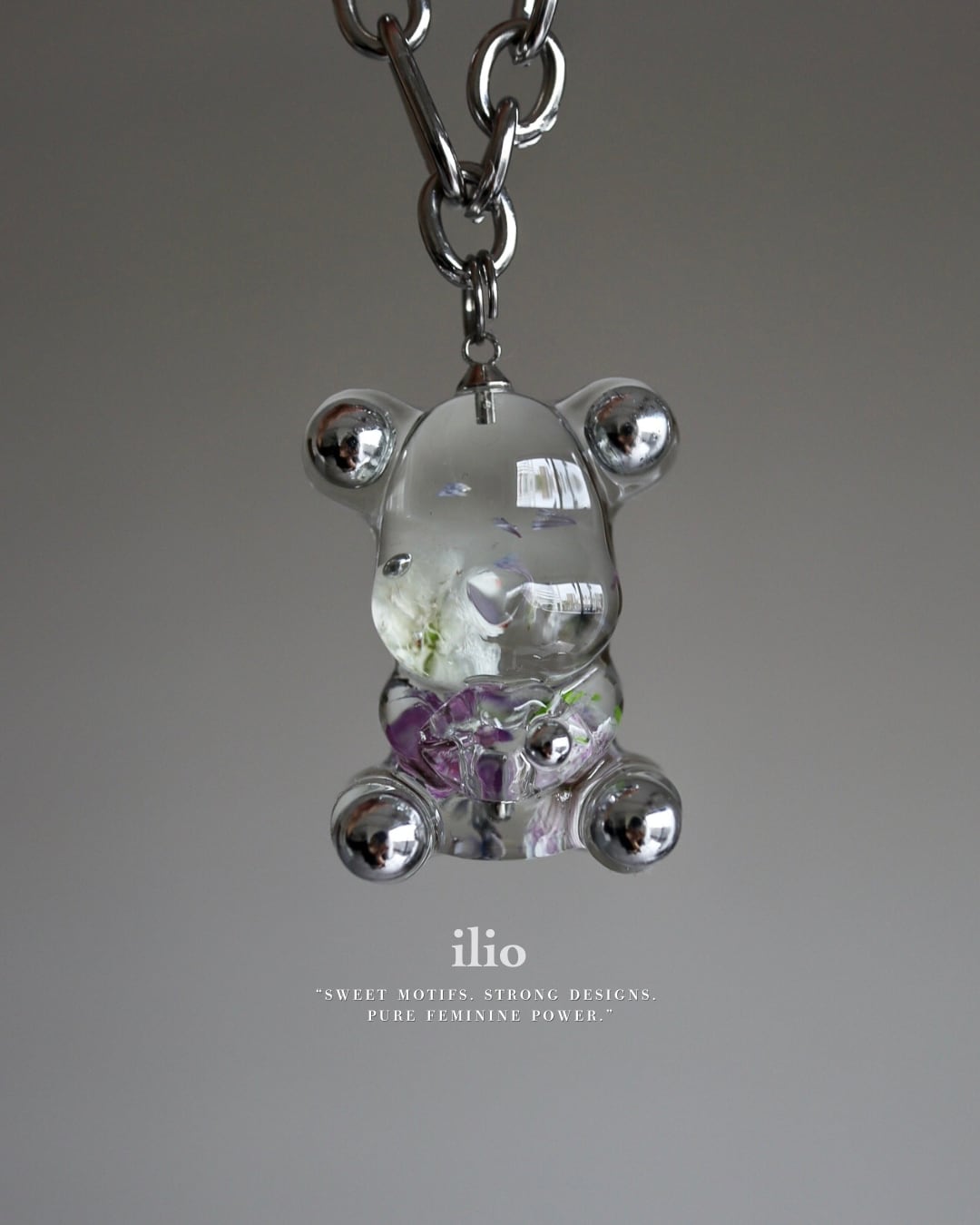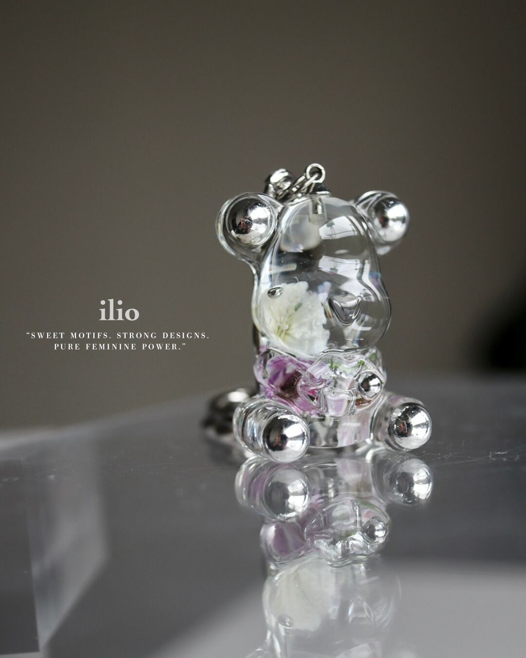 透明なくまの中に、花を閉じ込めたバッグチャーム。